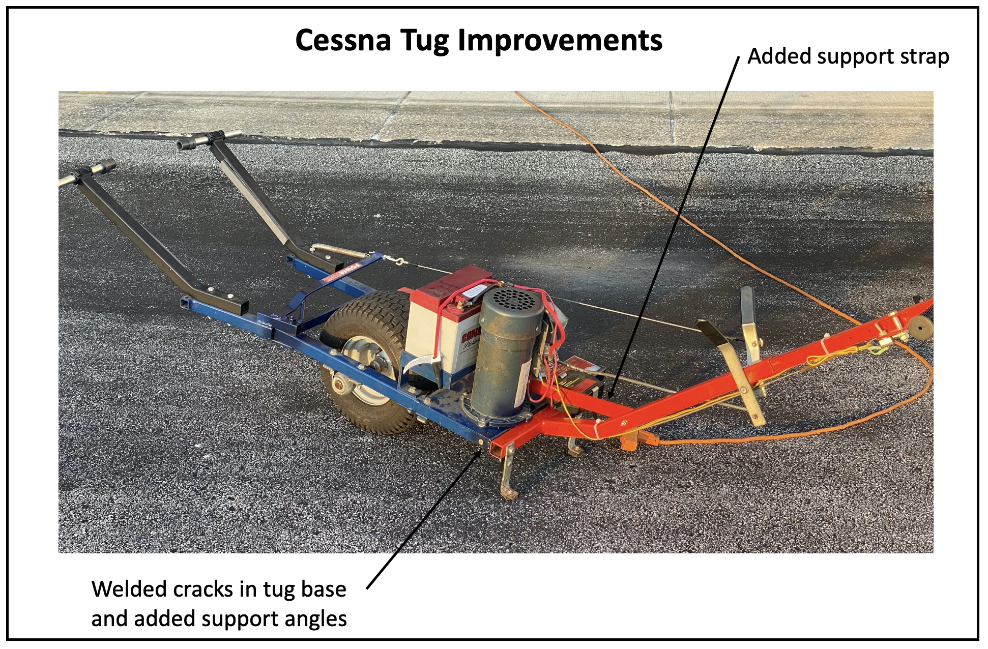Thanks to Larry for fixing the Cessna Tug. The Tug is a big help in putting the Cessna back in the hangar, but when you lifted the tug handle to turn the tug, the tug arms would come loose from the nose wheel. Larry found that the handle support welds under the tug were cracked and when you lifted the handle, the handle would flex and release tension on the arms causing them to come loose. Larry took the tug apart and rewelded the cracked supports and added a support arm to keep the handle from flexing. Now when you lift the tug handle to turn the plane, the arms stay firmly attached to the nose wheel