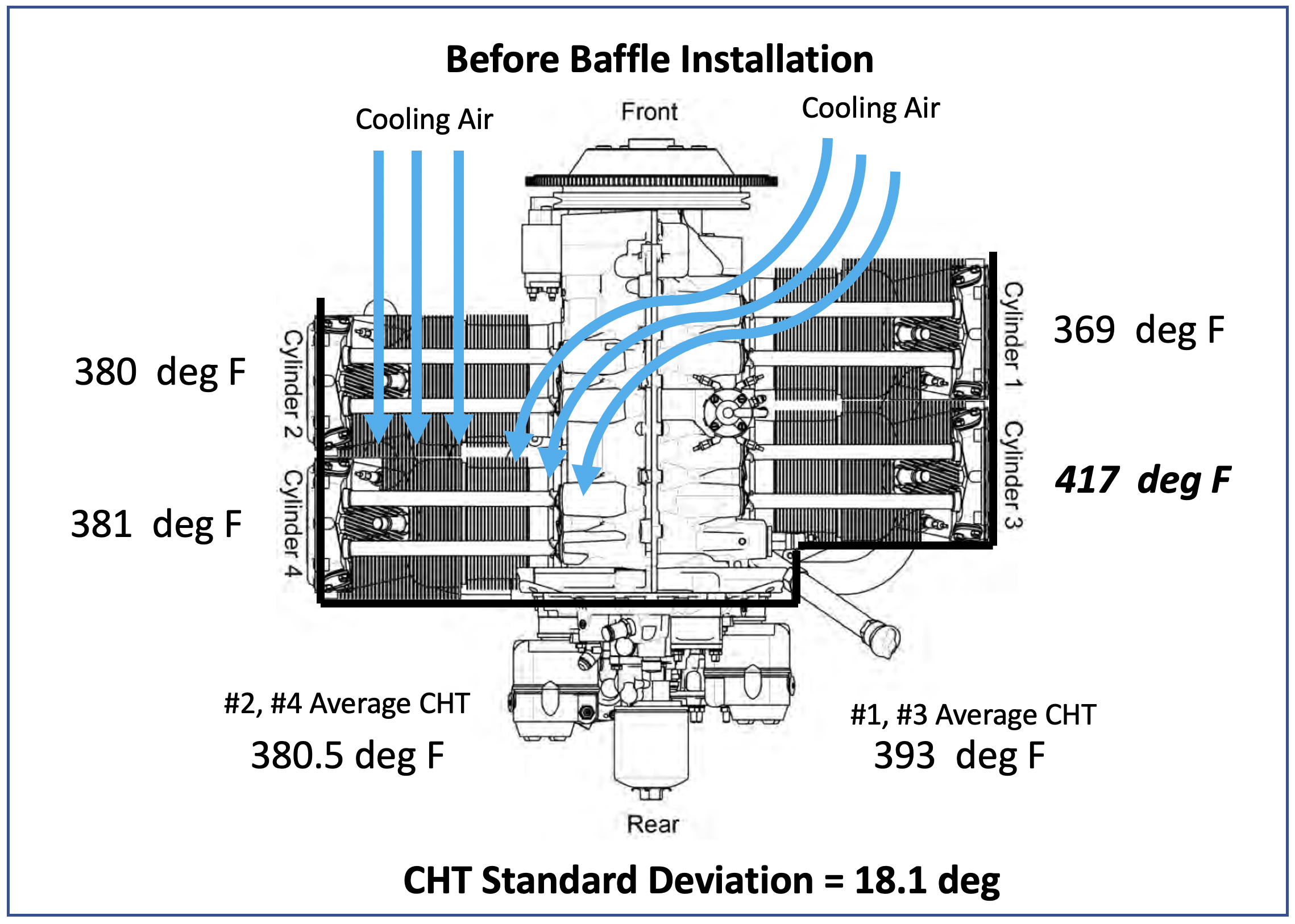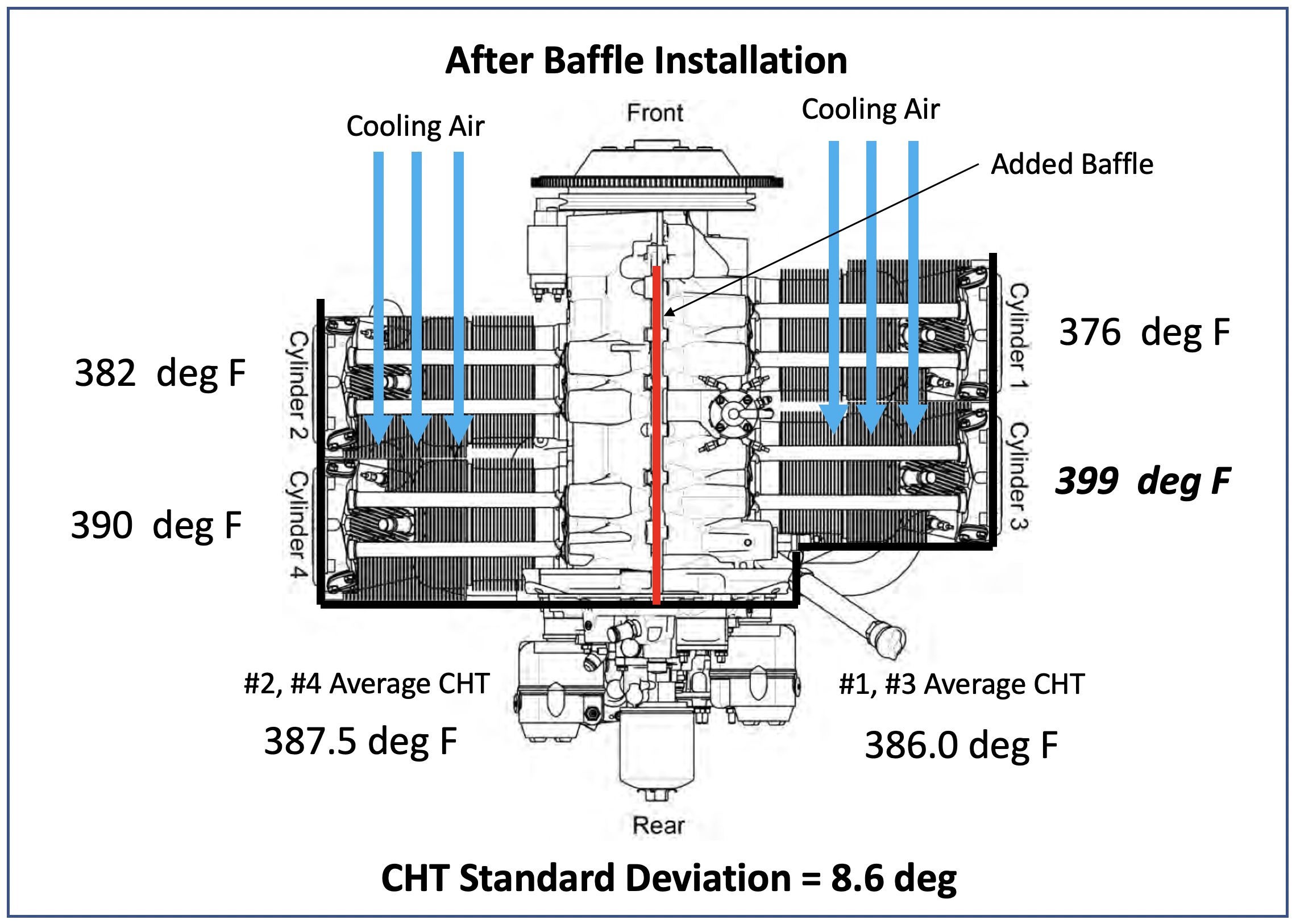 - Installed new baffle on top centerline of the engine to more evenly cool the cylinders. Comparable CHT data from before and after the baffle installation show how effective it is in more evenly cooling the cylinders.
