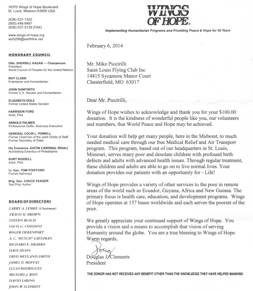 Here is the Wings of Hope thank you note for our $100 donation. ![]() Fly Safely! PIC