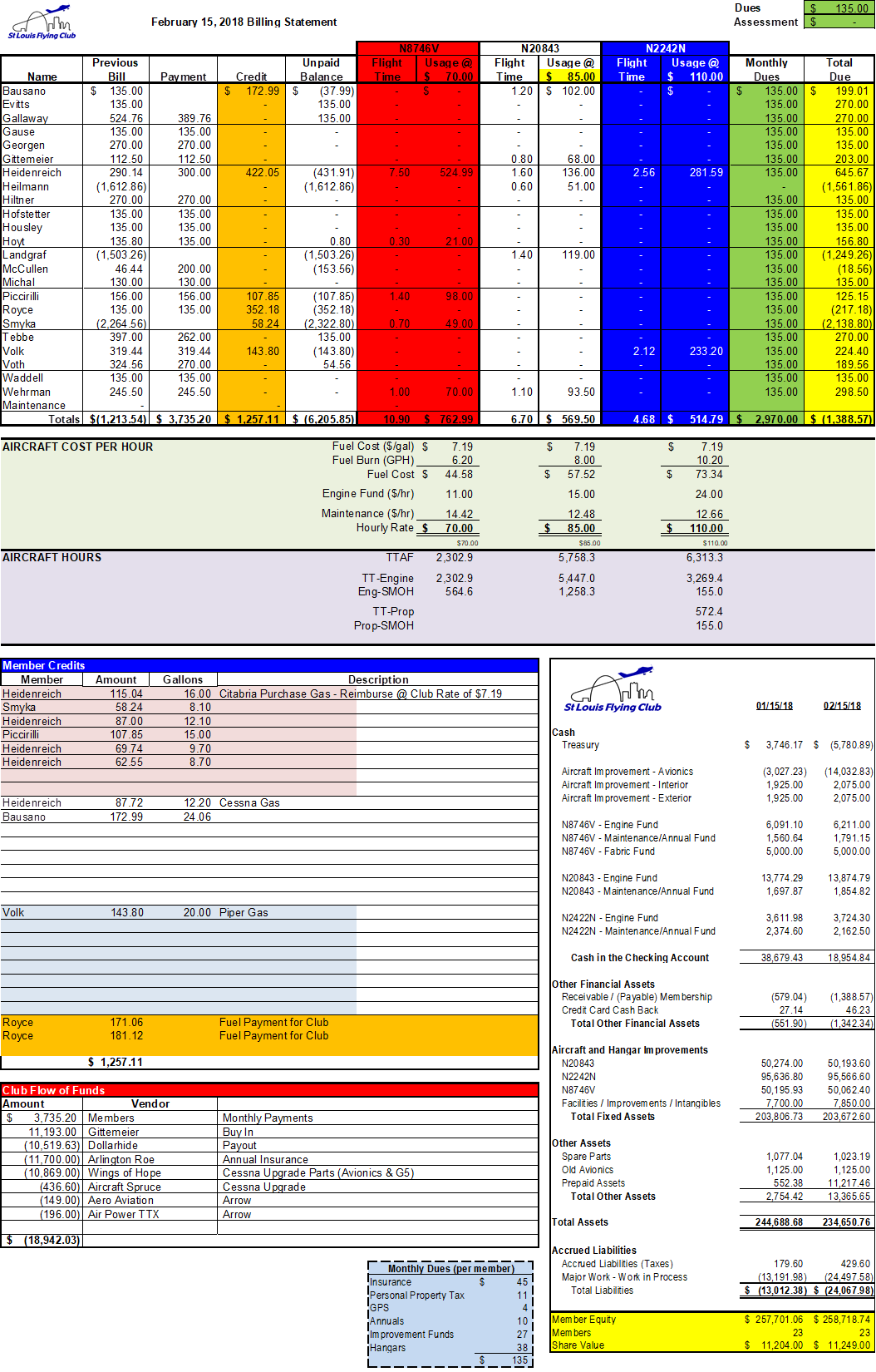 - Avionics Improvement – Similar to treasury, the avionics funds move even more negative in the month from the purchase for the Cessna. Monies will be replaced into the fund with 1) Sales of existing avionics, 2) an upcoming $150 assessment later in the spring, and 3) over time with our $300 per month addition.