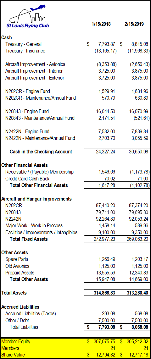 - Cash-General – While it appears large, keep in mind that these funds are largely earmarked for sales tax related to the RV (due 4/15/19 for $3,353.59) and the upgrade of the RV for ADS-B (budget = $4,000). Recall that we did move $3,000 out of general into “avionics” last year.