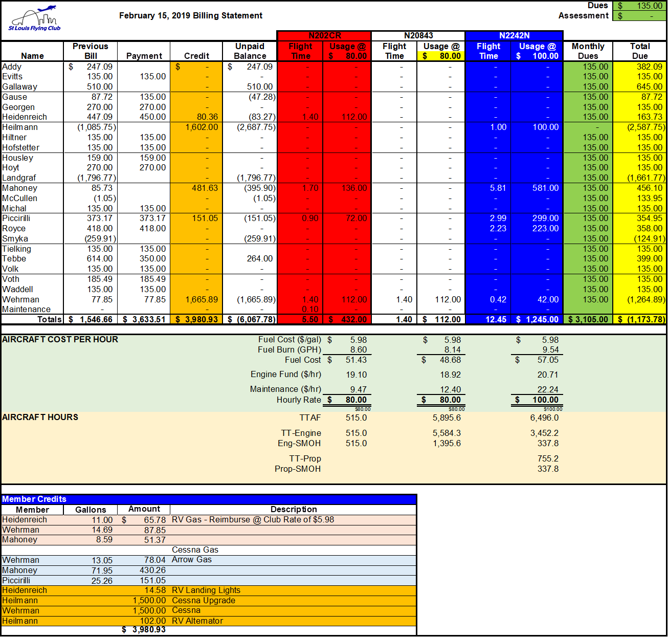 - Avionics – Congrats to John Heilmann and Pic again!! They sold the 430 and other items out of the Cessna for a total of $8,397.45. This drove the large overall increase in cash and is responsible for progress in the fund. The $8,397 plus our normal $300 per month was offset by $3,000 offset to John and Larry for all their efforts in the account.