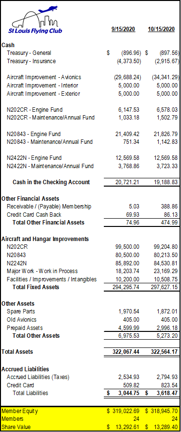 - Spare Parts/Old Avionics - Pic and John Heilmann have committed to completing and providing a detailed valuation of these line items. This process should be complete by the November 15 statement.