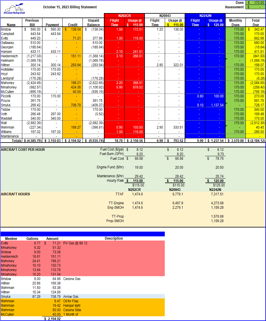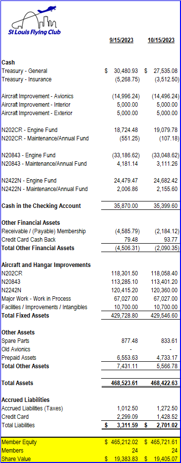 - Please note that these financials are as of October 15, so our books are closed before the Cessna went back into service and before the RV engine issues occurred. In addition, note that we have not yet recorded anything related to the Arrow incident as there are still too many unknowns; although it would appear that we are trending toward repairing the Arrow and that insurance will fully cover the loss, thus no impact to our financials.