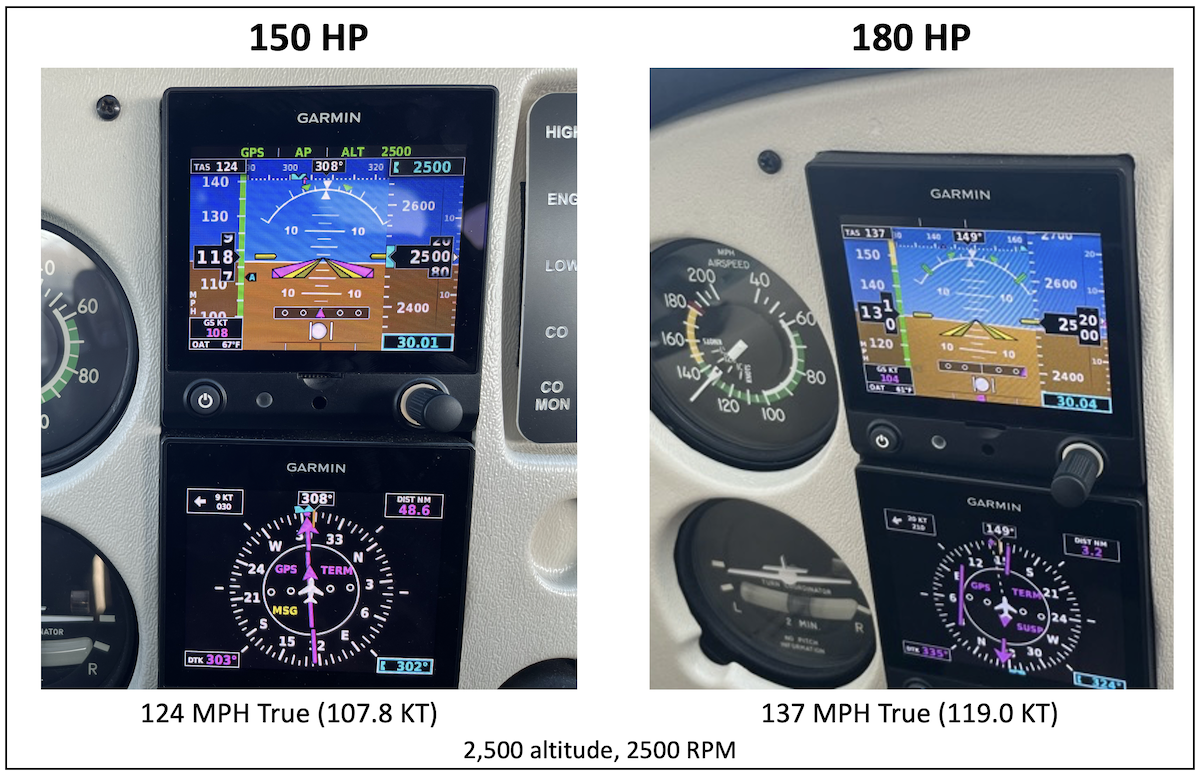 - 180 HP Upgrade - The 180HP upgrade and annual inspection were completed on 21 October 2023. An OAT and Manifold Pressure sender were added to the JPI Engine monitor to provide %HP and an oil Pressure sensor was added to warn the pilot of a low oil pressure condition. We are currently using Phillips Mineral Oil for engine break-in. If you need to add oil, use the black oil container with the M on it. The extra 30 HP gives us improved climb and cruise performance. Photo below shows before and after upgrade cruise speeds at 2500 RPM and 2,500 ft altitude.